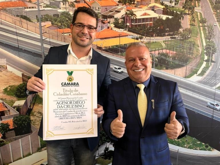 O Presidente da Câmara Municipal de Cuiabá, Chico 2000, entregou na terça-feira, 06 de junho, no gabinete da presidência, o título de cidadão cuiabano ao advogado Agenor Diego da Cruz Bino, mais conhecido como Dr. Diego. Para o presidente, honrar uma pessoa que esta em nossa capital há 25 anos contribuindo com a população, que construiu sua carreira e família em nossa cidade, é mais do que justo.