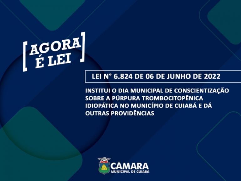 Agora é lei o Dia Municipal de Conscientização sobre a Púrpura Trombocitopênica Idiopática (PTI) no município e dá outras providências. De autoria da vereadora Michelly Alencar (União Brasil), a medida foi aprovada pela Câmara Municipal de Cuiabá no dia 12 de maio em sessão ordinária e sancionada pelo Prefeito no dia 06 de junho.