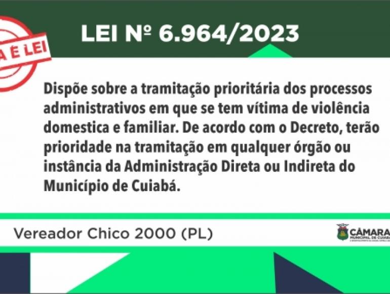 A Lei de número 6.964/2023 sancionada pelo prefeito Emanuel Pinheiro (MDB), tem como autor o presidente da Câmara Municipal de Cuiabá, Chico 2000 (PL), e dispõe sobre a tramitação prioritária dos processos administrativos em que se tem vítima de violência domestica e familiar.&nbsp