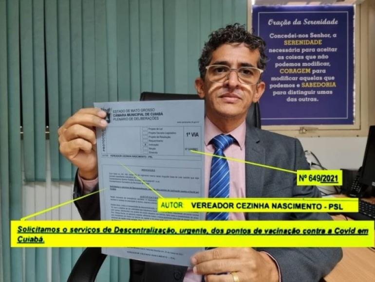 "Só no primeiro dia da instalação do atendimento pelo drive-thru mais de 500 pessoas receberam a vacina e isso já é um grande avanço. A implantação da descentralização irá, com certeza, dar mais agilidade aos atendimentos e quem ganha com isso é a população", pontuou Cezinha Nascimento, primeiro vereador a solicitar, através de indicação (nº 649/2021) ao prefeito de Cuiabá, Emanuel Pinheiro (MDB), a descentralização dos locais de vacinação contra a Covid-19 e a implantação de drive-thru. A solicitação ocorreu no dia 23 de março, durante sessão ordinária, virtual, na Câmara Municipal de Cuiabá.