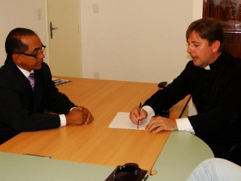 O primeiro vice-presidente da Casa de Leis, vereador Arnaldo Penha (PMDB), recebeu na ultima quinta-feira (05/04) o representante eclesiástico, Padre Evandro Baleno, da Paróquia São João Bosco, localizado no Bairro Cidade Alta que esteve visitando a Câmara de Cuiabá. Durante a visita Padre Evandro externou a preocupação com a comunidade Rural Mista do Chaparral, situada próximo à rodovia Emanuel Pinheiro, KM 13. Os moradores lutam a mais de dois anos pela reforma de duas pontes sobre o rio Bandeira.