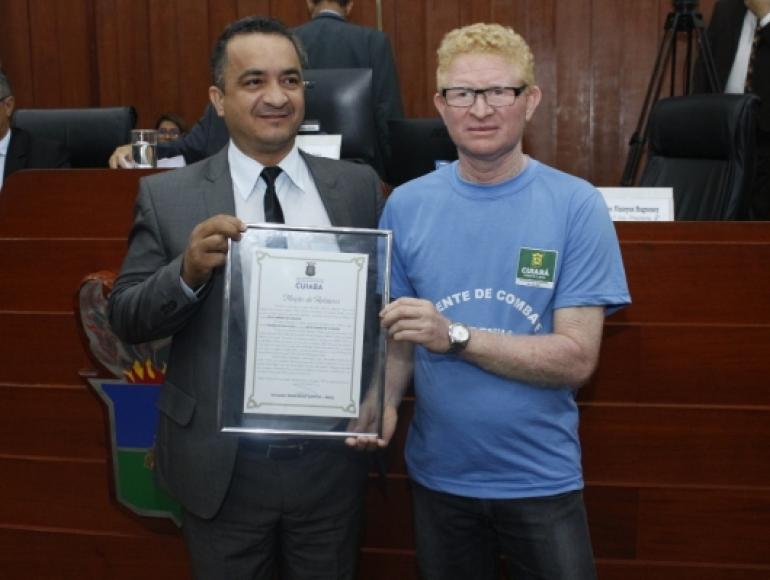 Na última terça-feira (02), durante sessão na Câmara Municipal de Cuiabá, o vereador Marcrean Santos (PRTB) homenageou, com Moção de Aplausos, Hélio Simião de Almeida. Ele tem distúrbio de Albinismo Oculocutâneo e superou o problema de visão, causado pela síndrome, através do estudo, do trabalho e projetos que desenvolve na capital.&nbsp