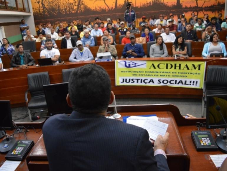 Centenas de pessoas lotaram hoje (11) o Plenário da Câmara de Cuiabá para prestigiar a Audiência Pública requerida pelo vereador Dr. Xavier, que debateu com elas o processo de regularização fundiária na comunidade Terra Prometida, região do Novo Paraíso II. Dr. Xavier entende que isso precisa ser resolvido urgentemente. "Essa liminar desabrigou pessoas realmente necessitadas de um teto, idosos e crianças situação indigna, de clara insensibilidade. Não aceitamos que famílias sejam expulsas dos seus humildes lares e jogadas ao relento, simplesmente para atender uma reivindicação de empresa construtora, que só visa lucros pessoais, financeiros".