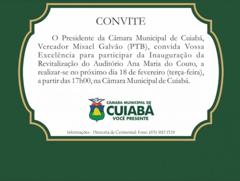 A Mesa Diretora da Câmara Municipal de Cuiabá inaugura nesta terça-feira, dia 18, o novo auditório Ana Maria do Couto, o “plenarinho”. A solenidade será realizada a partir das 17 horas.