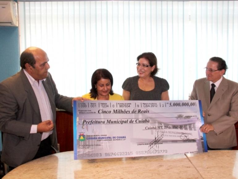 Em solenidade no gabinete da presidência da Câmara de Cuiabá, nesta manhã (30), o prefeito Francisco Galindo recebeu, das mãos do vereador Júlio Pinheiro (PTB), um cheque simbólico no valor de R$ 5 milhões. O recurso simboliza todos os repasses que a atual Mesa Diretora realizou nos dois últimos anos, retornando à Prefeitura os valores economizados do duodécimo.