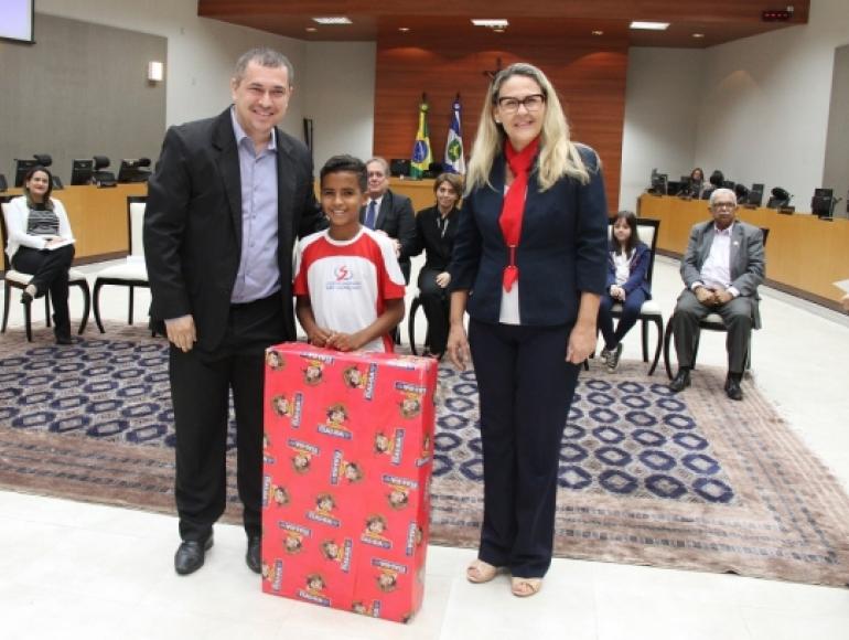 Ele recebeu uma televisão das mãos do vereador, como prêmio pela melhor redação do 5º ano.  “Já tinha ouvido falar sobre adoção, mas pesquisei também e aprendi que a adoção é um ato de amor. Podemos mudar uma vida quando damos a ela amor, carinho e uma família”, disse o estudante.