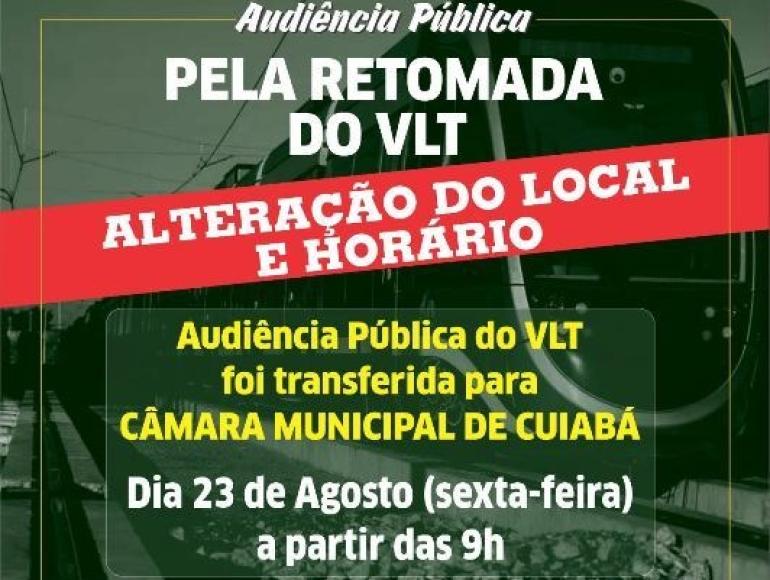 Para evitar possíveis problemas técnicos, a Câmara Municipal de Cuiabá informa que resolveu alterar o local e horário da audiência pública que visa debater a retomada das obras de implantação do Veículo Leve sobre Trilhos (VLT).