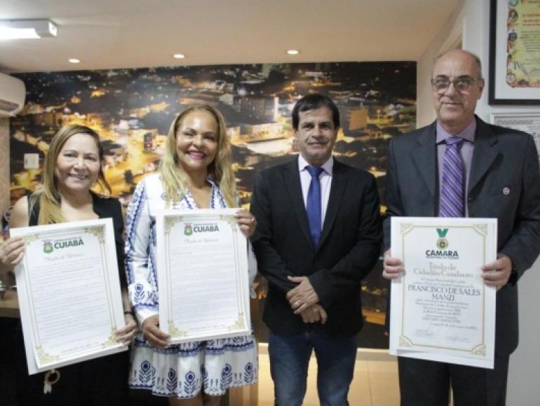 O vereador Adevair Cabral (PTB), concedeu na manhã desta terça-feira (04), duas Moções de Aplausos às senhoras Julcicleia Martins da Costa e Valdecy Batista Cadidé, e um Título de Cidadão Cuiabano ao senhor Francisco de Sales Manzi. A ação aconteceu no gabinete do parlamentar na Câmara Municipal de Cuiabá.
