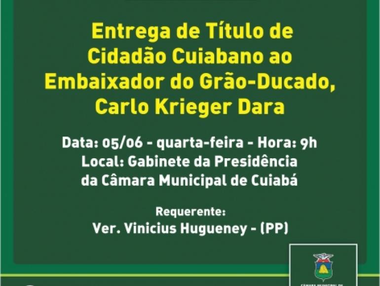 A Câmara Municipal de Cuiabá entregará nesta quarta-feira (05) o Título de Cidadão Cuiabano ao Embaixador do Grão-Ducado de Luxemburgo, Carlo Krieger, como reconhecimento aos inestimáveis serviços prestados à Capital de Mato Grosso.