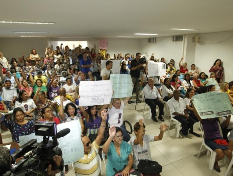 A audiência, que reuniu mais de 150 pessoas, entre servidores da assistência social, os atendidos pelas unidades e diversas lideranças comunitárias, seguravam cartazes e reivindicavam a manutenção dos serviços.