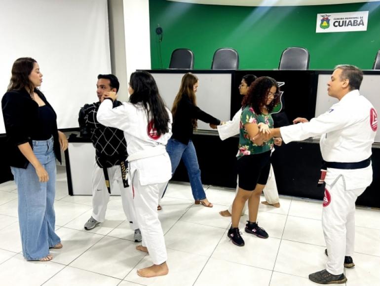 O curso foi ministrado pelo instrutor Fábio Bumlai, especialista em artes marciais, e reuniu servidoras do Legislativo e mulheres da comunidade interessadas em aprender técnicas básicas de proteção e prevenção em situações de risco.
