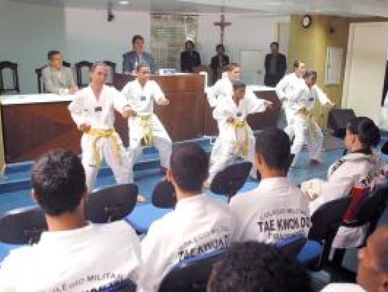 Atletas e dirigentes da milenar arte marcial Taekwondo receberam Moção de Aplausos do presidente da Câmara Municipal de Cuiabá, vereador Lutero Ponce. Durante o ato Lutero falou do orgulho de homenagear jovens amantes da arte que treina a mente através do corpo em busca da perfeição. Lamentou a falta de incentivo para prática desportiva no município e ressaltou que é autor da Lei de incentivo para empresas que adotarem atletas. “No Brasil existem muitas leis, mas poucas são cumpridas”, afirmou. Para o professor Éderson de Almeida Matos a Moção de Aplausos é o reconhecimento do esporte e o incentivo para os jovens atletas que treinam e se esforçam muito na conquista de títulos Apesar de recentemente introduzido no Ocidente, o Taekwondo possui raízes muito antigas Não impondo barreiras de idade ou sexo para a sua prática, esta arte marcial oferece uma série de benefícios à saúde mental e física, uma vez que atua como um todo nos sistemas cárdio-pulmonar, desenvolvendo coordenação, equilíbrio, força muscular, etc. A luta ensina humildade, coragem, estado de alerta e autocontrole. A repetição dos movimentos desenvolve a paciência, e o poder que o aluno adquire lhe dá autoconfiança. Foram homenageados com a Moção de Aplausos os seguintes atletas: Weslen Xavier de Souza Campos, Wenderson V. Anjos da Silva, Matheus Alves Macedo, Renan Piva Moraes, Marllon Douglas Batista Moreira, Lucas Matheus dos Santos,João Paulo dos Santos Lopes da Silva, Izidório Henrique Pereira Martins,Flávia Carolina Rodrigues Docatelli, Fernanda Costa de Oliveira, Dennir Diogo Ferreira da Silva, Camila Cristina de Almeida Josué, Bruna Chávez e Ed Carlos de Almeida Matos.