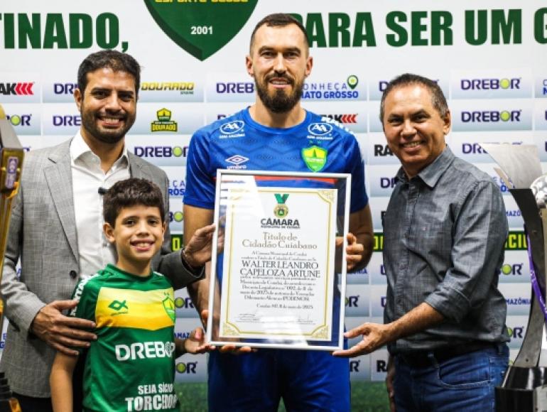 Ídolo da torcida do Cuiabá Esporte Clube, o goleiro Walter recebeu na tarde desta terça-feira (30), o Título de Cidadão Cuiabano. A honraria foi aprovada por unanimidade dos vereadores da Câmara Municipal de Cuiabá através de Decreto Legislativo de autoria do vereador Dilemário Alencar (Podemos).