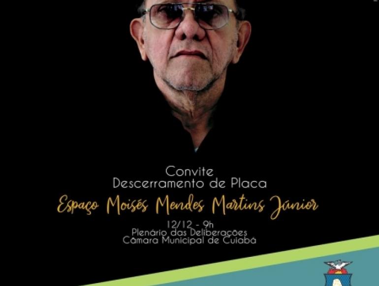 Nesta quarta-feira, às 09:00 hs, a Câmara Municipal de Cuiabá vai realizar o descerramento da placa do Espaço Moisés Mendes Martins Júnior. O evento é uma homenagem ao primeiro Secretário de Cultura da Casa, período que ficou marcado, dentre outros feitos, pela produção e lançamento dos Cadernos da Memória do Legislativo Cuiabano, cujas páginas contam a história da Casa de Leis e sua relação com a cidade que viria se tornar a Capital de Mato Grosso.