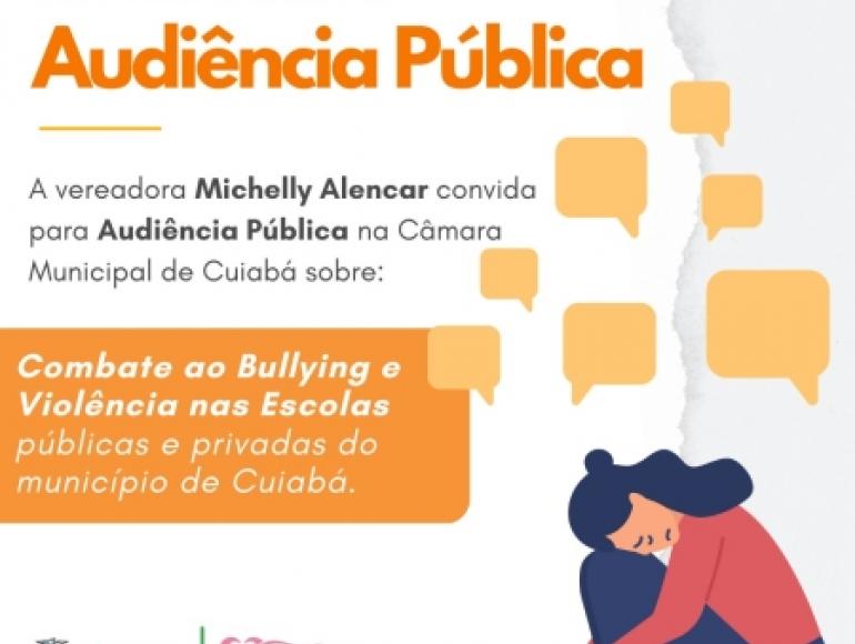 A Câmara Municipal realiza nesta segunda-feira (24), às 14h, audiência pública para debater o “Combate ao bullying e violência nas escolas públicas e privadas do município de Cuiabá”.