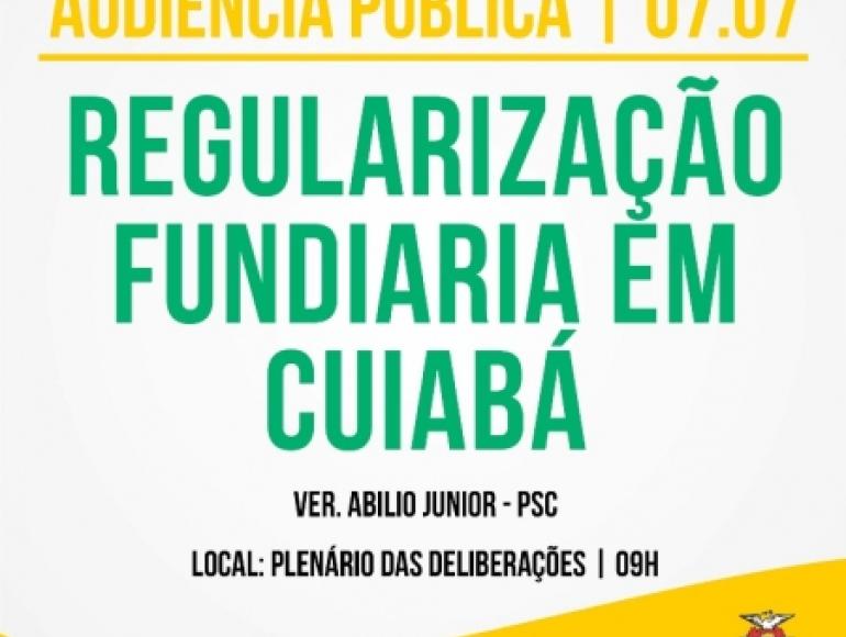 O Presidente da Câmara Municipal de Cuiabá, Vereador JUSTINO MALHEIROS NETO, convida Vossa Senhoria para participar da AUDIÊNCIA PÚBLICA requerida pelo Vereador ABÍLIO JÚNIOR – ABILINHO - PSC, para tratar junto com o Poder Público Municipal, Entidades e demais interessados acerca da Regularização Fundiária em Cuiabá.
