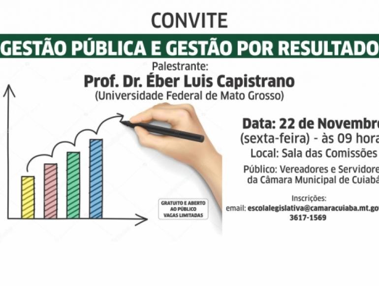 A Câmara Municipal de Cuiabá promove nesta sexta-feira, dia 22, a palestra “Gestão Pública e Gestão por Resultado”. Voltada para os vereadores e servidores do Parlamento Municipal, a intenção é capacitar os agentes públicos e os servidores do Legislativo, a fim de garantir maior eficiência na administração interna e, consequentemente, na prestação de serviço à sociedade.