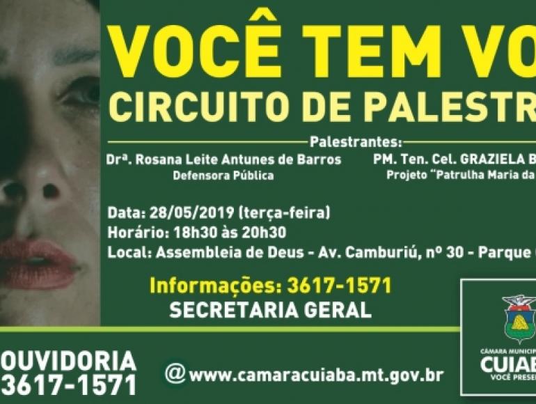 A Câmara Municipal de Cuiabá da continuidade às atividades voltada ao combate à violência contra a mulher, e realiza nesta terça-feira (28) a segunda palestra do Circuito iniciado neste mês.&nbsp