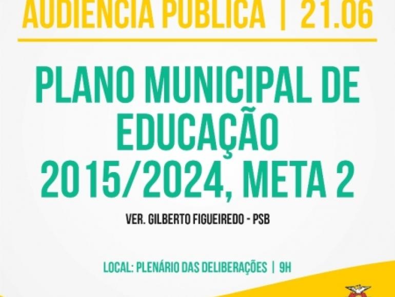 A Câmara Municipal de Cuiabá realiza, nesta quarta-feira (21), uma Audiência Pública para discutir o Plano Municipal de Educação 2015/2024, meta 2. A audiência ocorrerá no Plenário de Deliberações da Câmara, a partir das 09h:00. Requerida pelo Vereador GILBERTO FIGUEIREDO - PSB, presidente Comissão de Educação, Ciência, Tecnologia, Turismo, Desporto, Meio Ambiente, Cultura e Patrimônio Histórico, essa ação busca, dentre outras finalidades, monitorar o andamento e a execução das políticas relativas à educação.