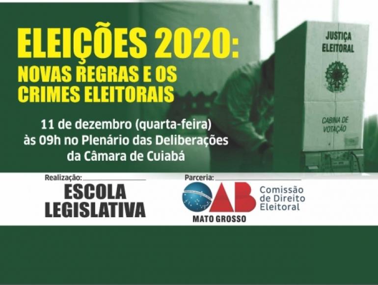 A Câmara Municipal de Cuiabá, por meio da Escola Legislativa, realiza nesta quarta-feira, dia 11, o seminário “Eleições 2020: novas regras e os crimes eleitorais”. Em parceria com a com a Comissão de Direito Eleitoral da Ordem dos Advogados do Brasil, seccional Mato Grosso (OAB/MT), a medida visa esclarecer as alterações promovidas na legislação eleitoral que passarão a valer a partir das eleições de 2020.