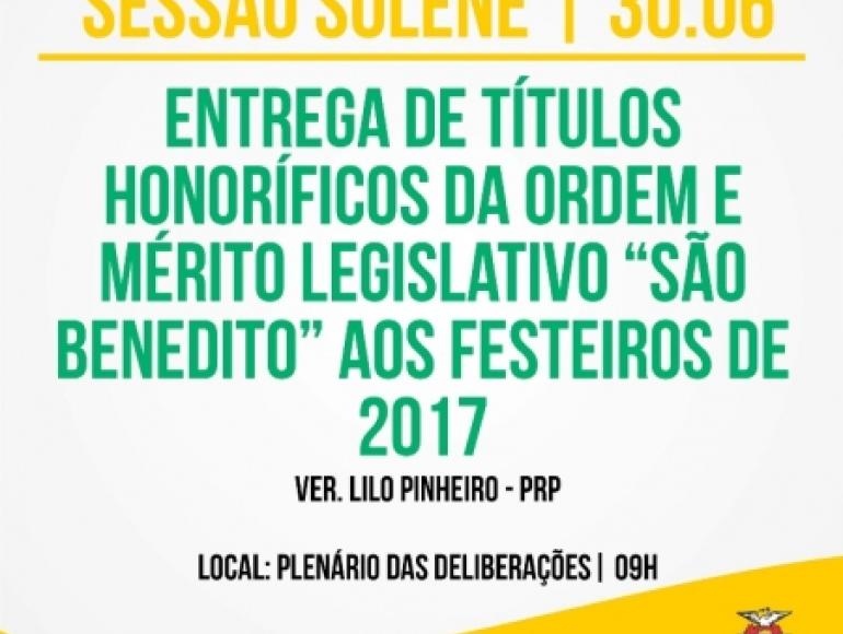 A sessão acontecerá no Plenário das Deliberações da Câmara, às 09h:00. Esta ação foi requerida pelo vereador Lilo Pinheiro e ela tem o objetivo de homenagear os festeiros que tradicionalmente organizam a festa de São Benedito.