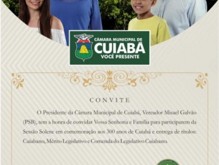 A Câmara Municipal de Cuiabá realiza no próximo dia 09 as 18 horas, no Hotel Fazenda Mato Grosso, um evento em comemoração aos 300 anos da Capital. Na oportunidade, os vereadores homenagearão algumas pessoas com Honrarias e Outorga de Título de Cidadão Cuiabano, pelo serviço prestado ao município.