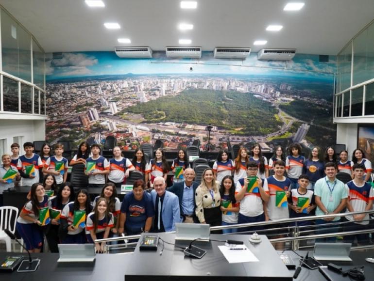 O Legislativo cuiabano recebeu na manhã desta terça-feira (26.03), os alunos do nono ano do Instituto Cuiabano de Educação (ICE), na terceira edição do Projeto Cuiabaninhos de 2024. Em homenagem a Semana da Constituição, os estudantes foram presenteados com uma edição da Carta Magna Brasileira.