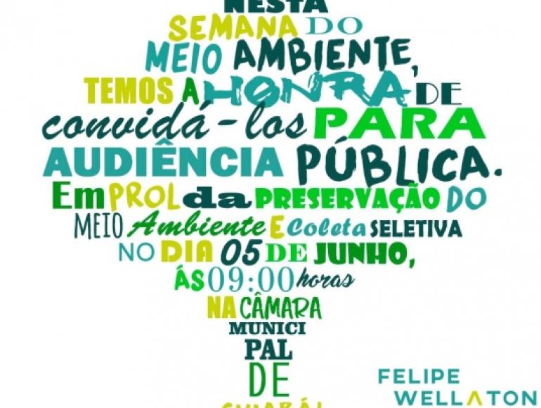 Abrindo o mês do meio ambiente, no dia 05 de junho será realizada uma audiência pública proposta pelo vereador Felipe Wellaton (PV), que tratará de políticas públicas para o meio ambiente e coleta seletiva da Capital.