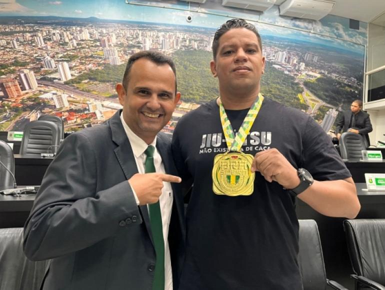 Nesta quarta-feira (29.06), Renato de Oliveira Campos, de 30 anos, marcou presença na Câmara Municipal de Cuiabá, para agradecer o vereador, Sargento Joelson (PSB), por auxiliar em sua conquista da medalha de ouro do campeonato nacional  de Jiu-Jitsu Esportivo, na categoria Peso Pesado, promovido pela Confederação Brasileira, em São Paulo. Renato faz parte do projeto social Jiu-Jitsu Rotam.