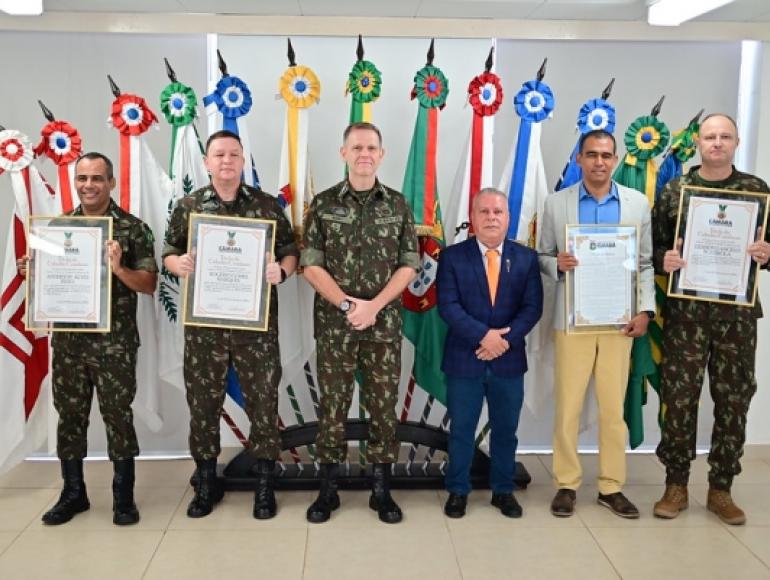 O presidente da Câmara Municipal de Cuiabá, vereador Chico 2000 (PL), realizou na manhã desta quarta-feira (20.12), uma cerimônia de entrega de Títulos de Cidadão Cuiabano e Moção de Aplausos, na 13ª Brigada de Infantaria Motorizada. Os títulos foram entregues aos coronéis Anderson Alves Pinto e Rogério Gomes Marques, e ao subtenente Leandro Angelo Rostirola. Já a Moção, ao Coronel Bertoldo.