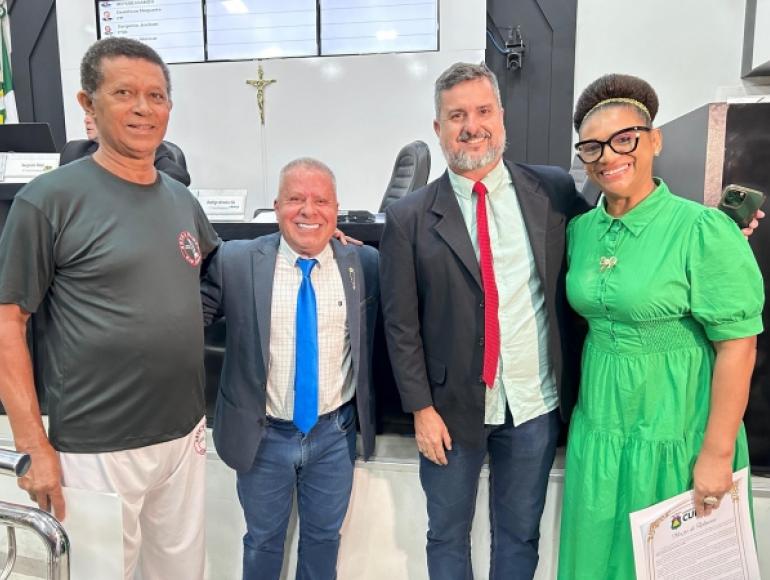 Durante o evento em celebração ao Dia da Consciência Negra, realizado nesta terça-feira (19), o presidente do Legislativo Cuiabano, vereador Chico 2000 (PL), homenageou com uma Moção de Aplausos a professora, pesquisadora e importante figura na luta pela igualdade racial em Cuiabá, Dra Mory Márcia de Oliveira Lobo e o mestre capoeirista Eron Miguel Bezerra Silva.