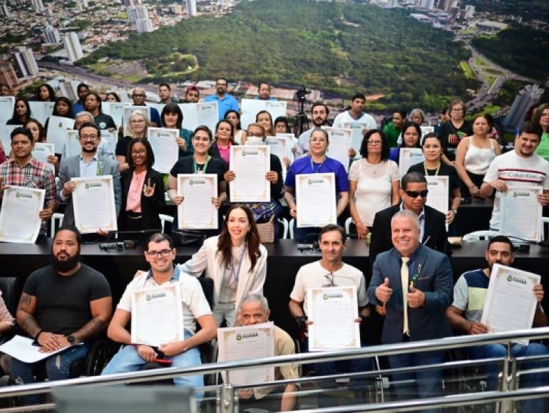 O presidente da Câmara Municipal de Cuiabá, Chico 2000 (PL), homenageou atletas com deficiência durante sessão solene nesta quarta-feira (20). Foram entregues Moções de Aplausos em braile, de maneira inédita, possibilitando que atletas cegos tivessem a oportunidade de ler a honraria. A cerimônia ocorreu em parceria com a vereadora Maysa Leão (Republicanos).