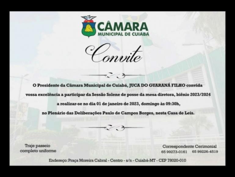 A posse da nova Mesa Diretora da Câmara Municipal de Cuiabá, biênio 2023-2024, ocorrerá neste domingo (01/01/2023), às 9h30, no Plenário das Deliberações Paulo de Campos Borges.