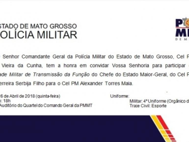Nesta quinta-feira (26), haverá a da Transmissão de Função de Chefe de Estado Maior do Comando Geral da Polícia Militar do Estado de Mato Grosso. Essa atividade ocorrerá às 18 horas no Quartel do Comando Geral da Policia Militar do Estado de Mato Grosso.
