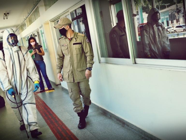 Seguindo o planejamento determinado pela presidência e o Comitê de Enfrentamento ao Covid-19 da Câmara Municipal de Cuiabá. Na manhã desta sexta-feira, dia 22, a equipe do Tenente Wihby, do Corpo de Bombeiros Militar de Mato Grosso, realizaram a desinfecção biológica das dependências internas e externas do Parlamento Municipal.