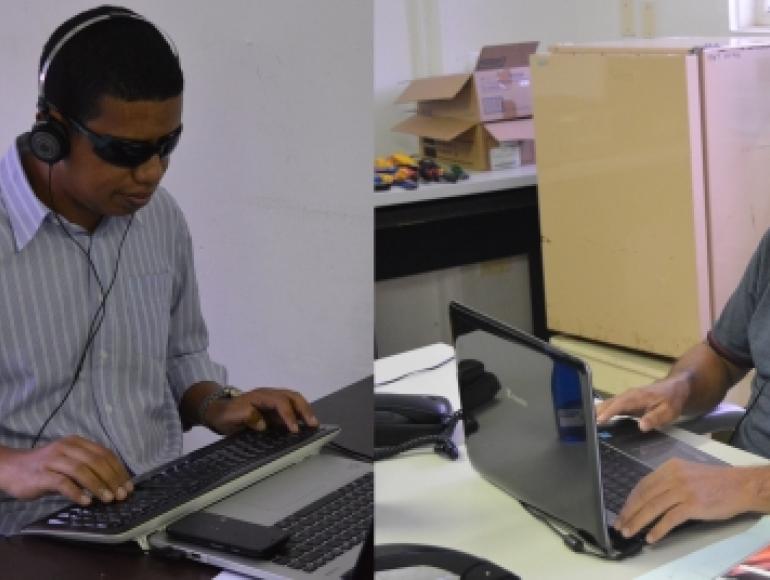 Durante a entrevista, Odenilton não desgrudou os olhos do computador, fator intrigante para quem nada vê nada diante de si. Na verdade, ele não vê, mas escuta "enxerga" os dizeres da tela computadorizada por meio de um sistema sonoro (leitor de tela) interligado à máquina. Os fones de ouvido são inseparáveis auxiliares nas horas de expediente dos dois técnicos.&nbsp