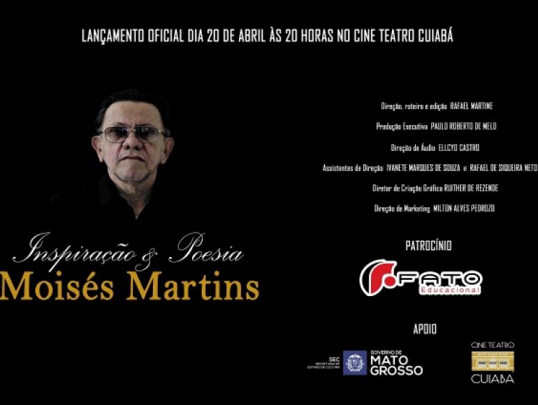 O Cine Teatro Cuiabá terá uma movimentação extra no dia 20 próximo, a partir das 20h, horário de exibição do documentário acerca da vida do poeta cuiabano Moisés Martins, referência cultural nessa área e em outros segmentos ligados à cultura local e estadual. O documentário, produção executiva de Paulo Roberto de Melo e do diretor Rafael Martine, começou a ser trabalhado em junho de 2017, com finalização agora em abril. Na opinião de Martine, trata-se de documento audiovisual, que retrata, passo a passo, traços singulares da personalidade do poeta e sua respectiva contribuição ao setor cultural mato-grossense. Indagado sobre quem é Moisés Martins, na sua concepção, o diretor disse que, para ele, é um dos maiores escritores e artistas brasileiros, capaz de traduzir, por meio das palavras, "toda a singularidade contida na essência da letra poética".