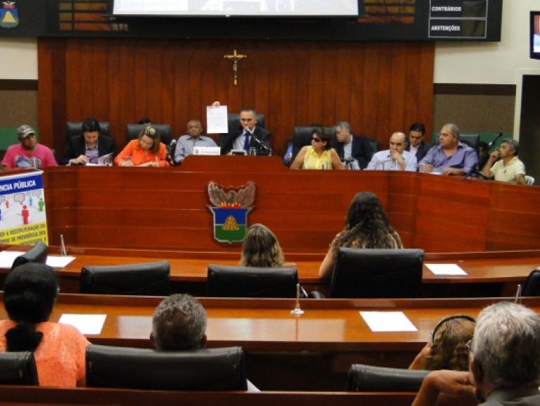 A Câmara dos Vereadores de Cuiabá realizou na quarta-feira (07), Audiência Pública para debater proposta do Executivo Municipal que reestrutura o Regime Próprio da Previdência dos Servidores do Município de Cuiabá. A audiência foi requerida pelo vereador Dilemário Alencar (PTB) e contou com a participação de secretários municipais e de diversos representantes das entidades representativas dos servidores municipais ativos e aposentados.