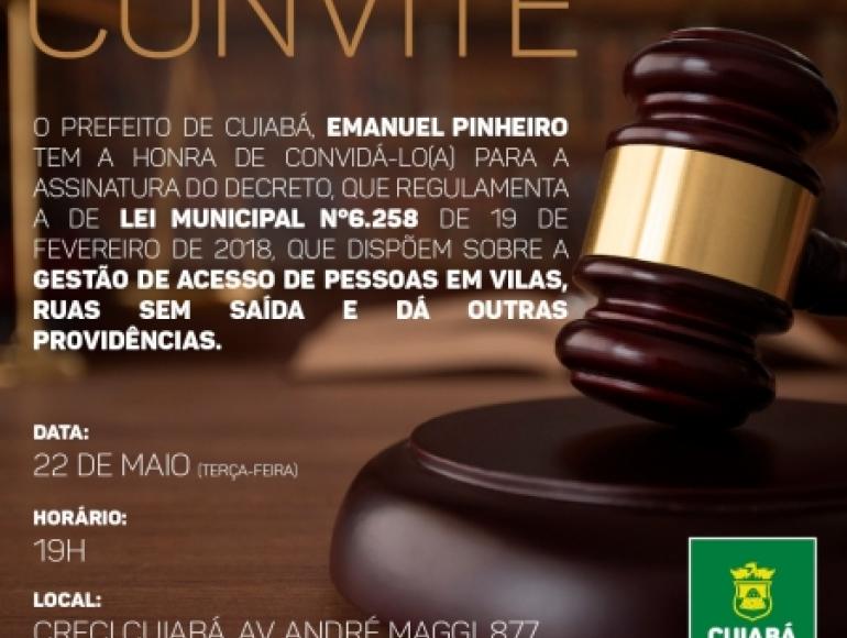 O prefeito Emanuel Pinheiro (MDB) assina nesta terça-feira (22), às 19h, o decreto que regulamenta a lei n° 6.258, de autoria do vereador Luis Claudio (PP), que dispõe sobre a gestão do acesso de pessoas nas ruas sem saída de Cuiabá.