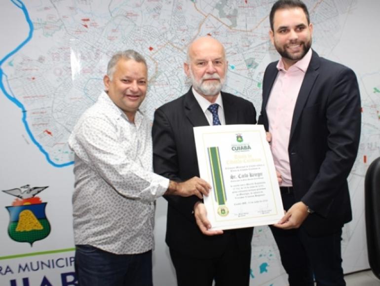 Além do Título, Carlo também recebeu um livro das mãos do Embaixador da Cultura Cuiabana, Victor Hugo. “É o nosso papel. Recebemos o decreto de embaixador de Cuiabá especialmente na cultura. Hoje estamos cumprindo nosso papel, entreguei ao embaixador uma revista chamada Cuiabá Live, onde mostra toda a história de Cuiabá. Esse é o nosso deverl, manter a cultura próxima”, contou Hugo.