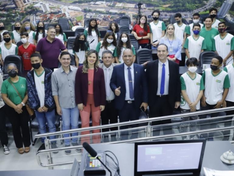 A Câmara Municipal de Cuiabá por meio do Núcleo da Escola do Legislativo realizou na manhã desta quinta-feira (26) mais uma visita guiada do Projeto Cuiabaninhos na Câmara.&nbsp Os alunos do oitavo ano da Escola Municipal de Ensino Básico (EMEB) Senador Darcy Ribeiro que estiveram na Casa&nbspde Leis. A&nbspexcursão voltou a ser realizada em abril de 2022 depois de dois anos suspensa devido a pandemia da Covid-19.