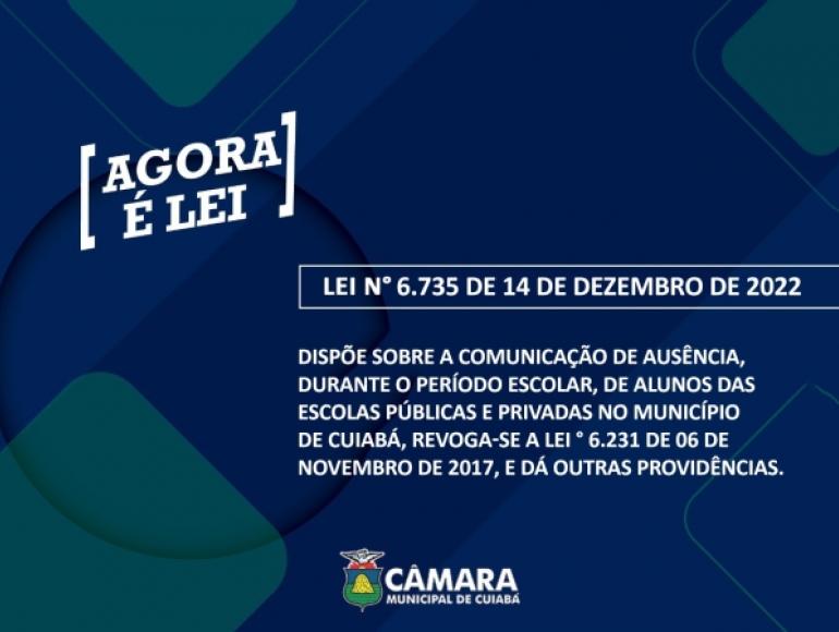 Com apenas duas semanas para o início do ano letivo, o Executivo Municipal sancionou a lei nº 6.735 de 14 de dezembro de 2021, que estabelece a necessidade de informação sobre a ausência de alunos de escolas públicas e privadas, durante o período escolar, revogando a lei nº 6.231 de 06 de novembro de 2017.