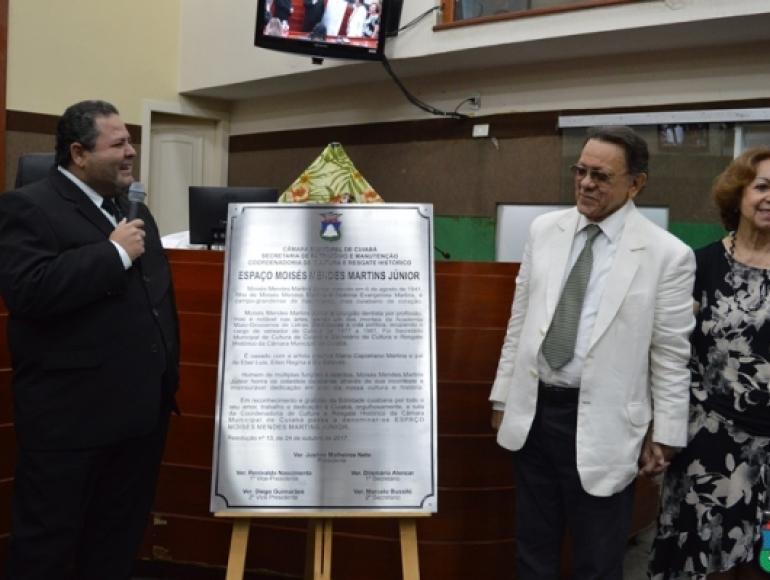 Familiares do homenageado e personalidades tanto da política quanto da cultura cuiabana participaram do evento de descerramento da placa do Espaço Moisés Mendes Martins Jr, realizado nesta quarta-feira (12), pela manhã, no Plenário das Deliberações na Câmara Municipal de Cuiabá.