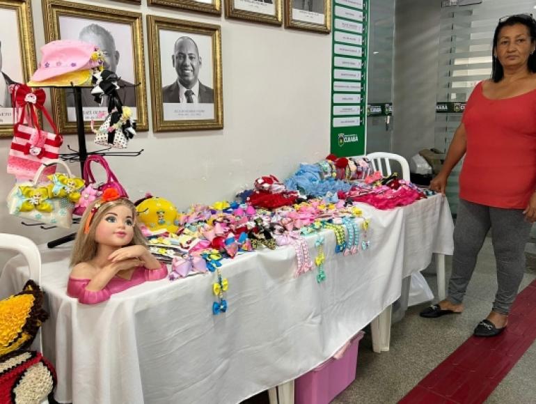A expositora Jocineide Pereira, 59 anos, vende laços, tiaras e calcinhas personalizadas para crianças e comentou sobre seu trabalho e a fomentação da cultura pela Casa de Leis.