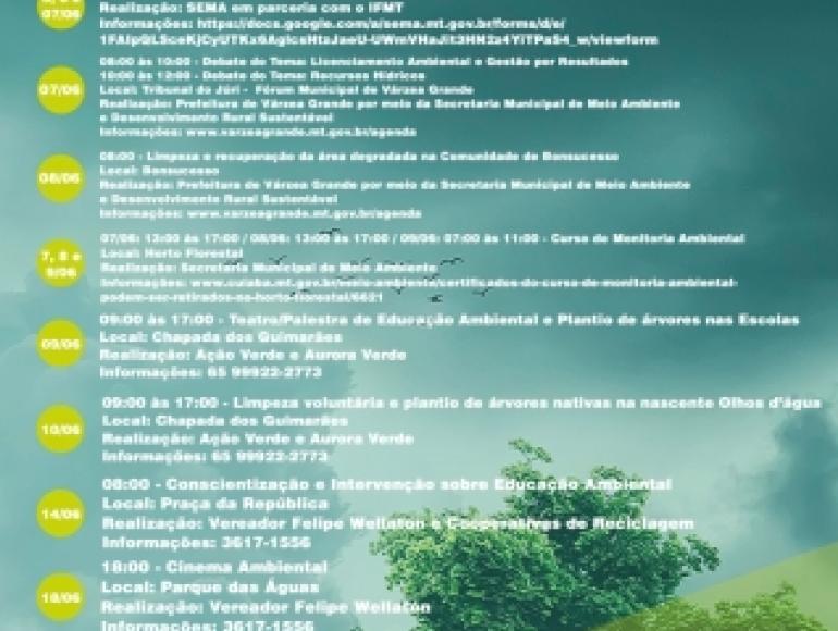 A “Agenda Verde” vai ajudar o cidadão se orientar com a diversa programação que temos. No dia 08 de junho, o vereador Felipe Wellaton, junto à bancada do PV da Câmara Municipal, apresentará um Projeto de Lei de sua autoria que pretende instituir o “Junho Verde” no calendário oficial de Cuiabá, fazendo assim o mês junho ser dedicado a ações e discussões de políticas públicas voltadas para preservação do meio ambiente.