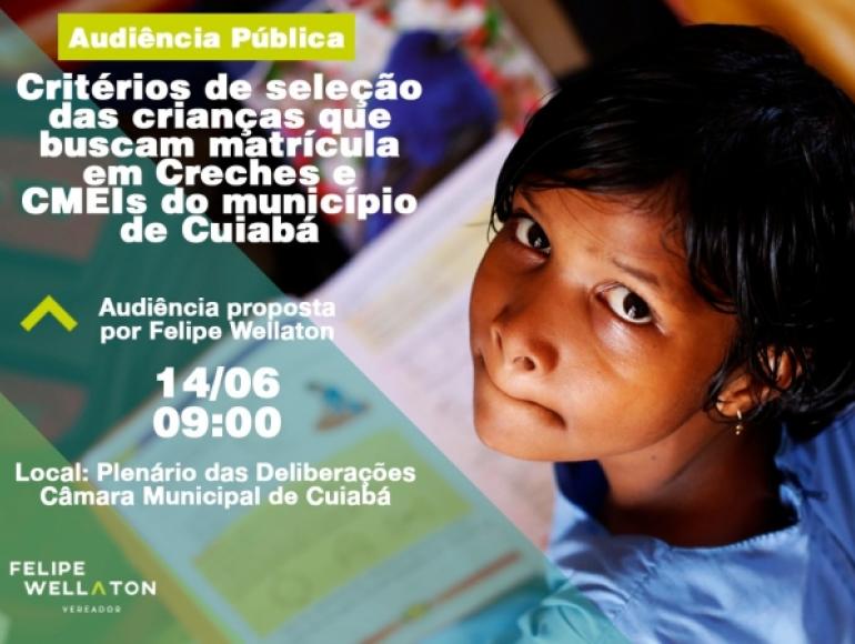 O Vereador Felipe Wellaton convida Vossa Excelência para participar da Audiência Pública que discutirá sobre os critérios de seleção das crianças que buscam vagas nas creches e CMEIS do município de Cuiabá.