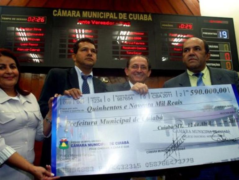 O prefeito Chico Galindo agradeceu à Câmara de Cuiabá, em cerimônia simbólica na manhã desta terça-feira (12/04), pela devolução de R$ 590 mil em recursos financeiros economizados nos primeiros 100 dias degestão. A verba é para a Prefeitura da Municipal investir naconstrução de uma creche no bairro São Matheus (atrás da Unic), na região Leste da Capital.