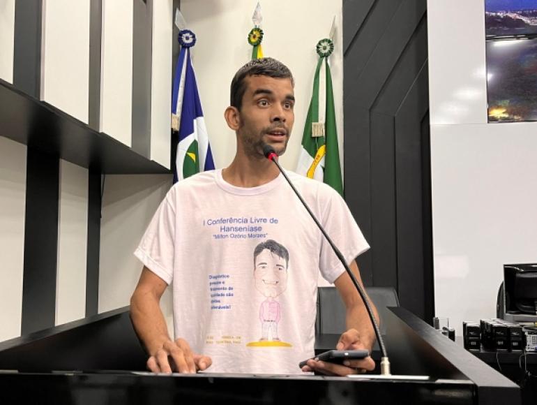 Na tribuna livre, durante sessão parlamentar desta terça-feira (20), a vereadora Edna Sampaio (PT) convidou João Victor Pacheco a fazer uma fala sobre as pessoas atingidas pela hanseníase, doença negligenciada pelo Estado que atinge milhares de brasileiros por ano.