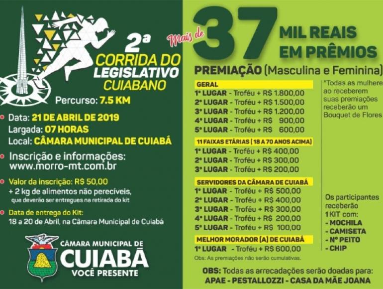 Já estão abertas as inscrições para a 2ª Corrida do Legislativo Cuiabano. No total, estão disponíveis 1000 vagas. Os interessados têm até o dia 12 de abril para se inscreverem por meio do site www.morro-mt.com.br.