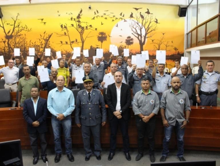 Em Sessão Solene realizada hoje (28), o vereador Sargento Joelson (PSC) homenageou os componentes da Guarda Patrimonial do Estado, formada por policiais militares e bombeiros militares, reservistas, com a entrega de Moções de Aplausos.